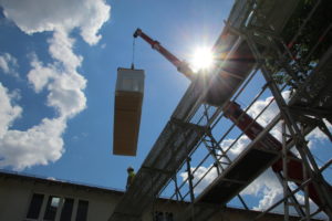 Heute konnten die gespannten jungen Schüler und Schülerinnen den Klassiker „Das fliegende Klassenzimmer“ von Erich Kästner mal live vor Ort erleben. Mit weit aufgerissenen Augen bewunderten die Zuschauer die Montage der Holzmodule, welche per Kran hoch in die Lüfte gehoben worden sind. Anschließend „flogen“ die Module exakt auf die gewünschte Position – und das auf den kleinsten Millimeter genau! Unsere tatkräftigen Montagearbeiter rund um unseren Bauleiter Torsten Jahn verlieren dabei keine Zeit, sodass das neue Gebäude termingerecht fertiggestellt werden kann!